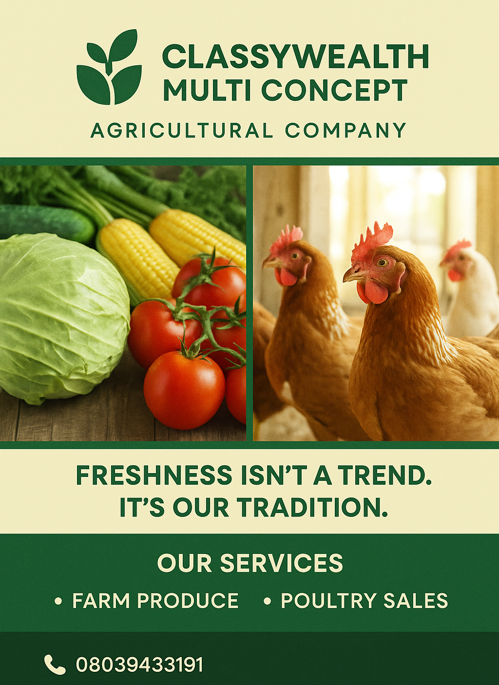 CLASSYWEALTH AGRO is a trusted agribusiness dedicated to providing high-quality farm produce and sustainable poultry farming solutions. We specialize in the sales of fresh, nutritious agricultural products while maintaining modern farming practices that ensure quality, affordability, and customer satisfaction. Our mission is to contribute to food security, empower local farmers, and deliver excellence in agribusiness through innovation and integrity.